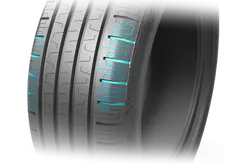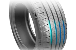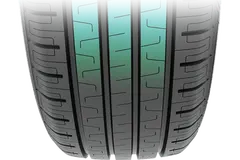 El refuerzo central combinado con ranuras escalonadas aumenta exitosamente la superficie de carrera y mejora el rendimiento del agarre en mojado.